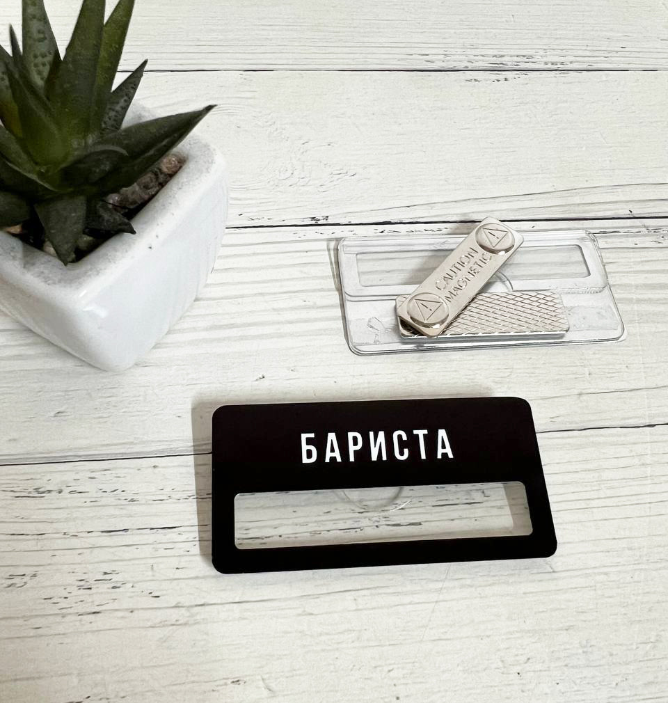 Бейджі для персоналу бариста чорні металеві з вікном для змінної інформацією на магніті 38х75 мм